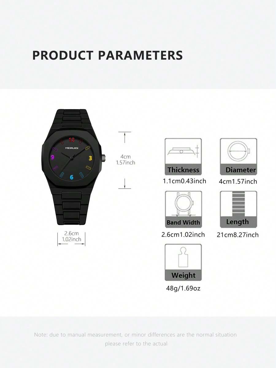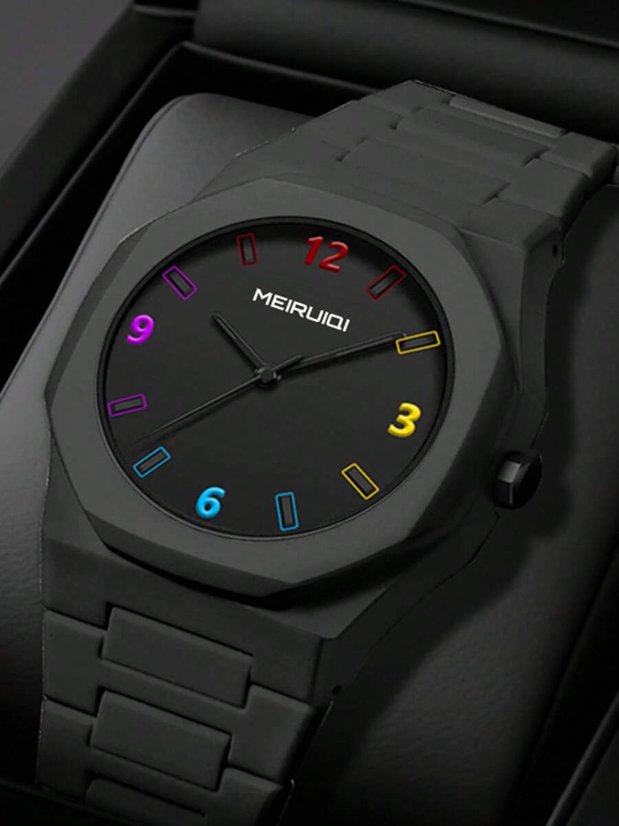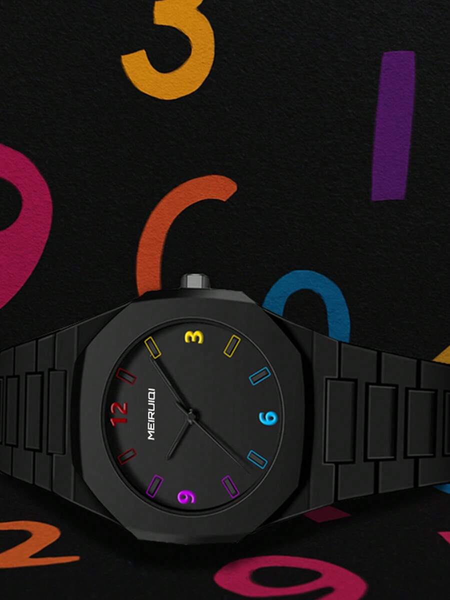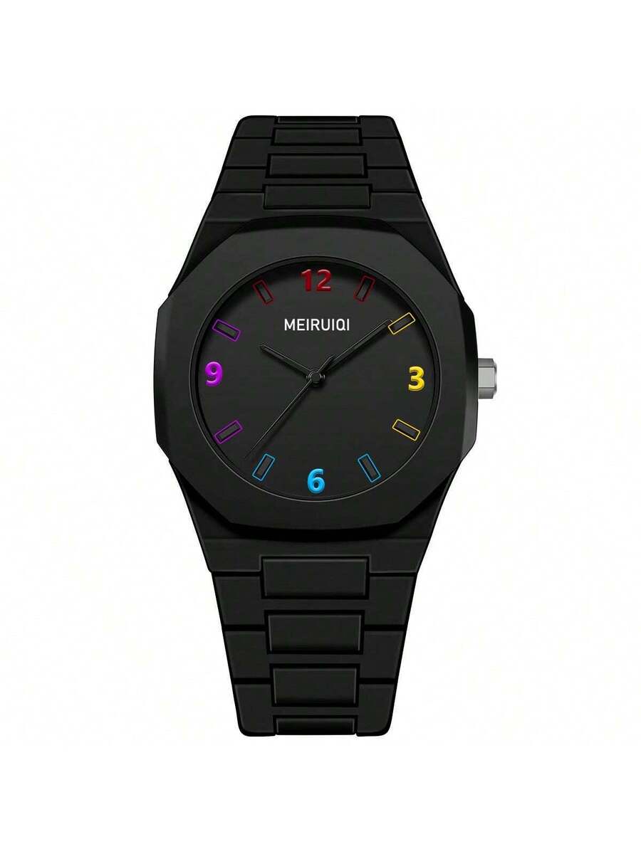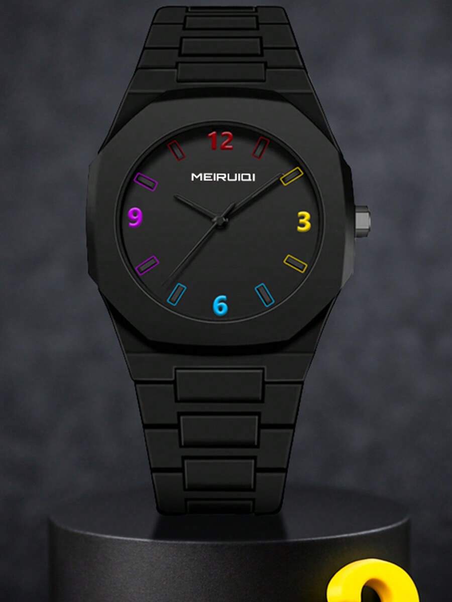 Make a statement with this sleek, all-black timepiece featuring a vibrant rainbow twist. Designed with a modern octagonal bezel and a comfortable integrated link bracelet, this watch blends urban street style with classic luxury aesthetics. The matte black dial is accented by colorful hour markers (3, 6, 9, 12), making it both a functional timekeeper and a standout accessory for any outfit.
